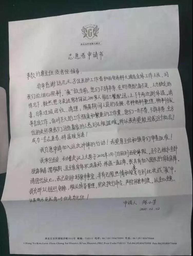 2月1日,解除留觀回家,陳小芳想當(dāng)志愿者的想法獲得了家人的鼓勵支持。緊接著,她向高新區(qū)留觀點(diǎn)臨時黨支部遞交了志愿者申請書。其中寫道:“面對巨大的工作強(qiáng)度和繁重的工作量,您們一絲不茍,不辭辛勞,全方位的關(guān)懷使我們這些離家的人感到無限溫暖。所以我希望我也能成為一名志愿者,將溫暖傳遞,我自愿申請加入這次沖鋒行動!”