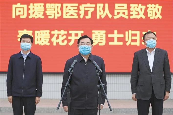 胡和平代表省委、省政府和全省人民,歡迎白衣戰(zhàn)士們平安凱旋,向仍然堅(jiān)守在湖北的醫(yī)療隊(duì)員表示誠(chéng)摯慰問(wèn),向醫(yī)務(wù)人員家屬的理解和支持表示衷心感謝。胡和平指出,習(xí)近平總書記十分關(guān)心關(guān)愛(ài)一線醫(yī)務(wù)人員,黨中央、國(guó)務(wù)院作出了一系列安排。希望大家在接下來(lái)的這段時(shí)間里安心休養(yǎng),調(diào)整好身心和精神狀態(tài)。休整結(jié)束后,要繼續(xù)保持在這次抗疫戰(zhàn)斗中展現(xiàn)出的良好精神風(fēng)貌,立足崗位、努力工作,為奪取疫情防控和實(shí)現(xiàn)經(jīng)濟(jì)社會(huì)發(fā)展目標(biāo)任務(wù)雙勝利再立新功。
