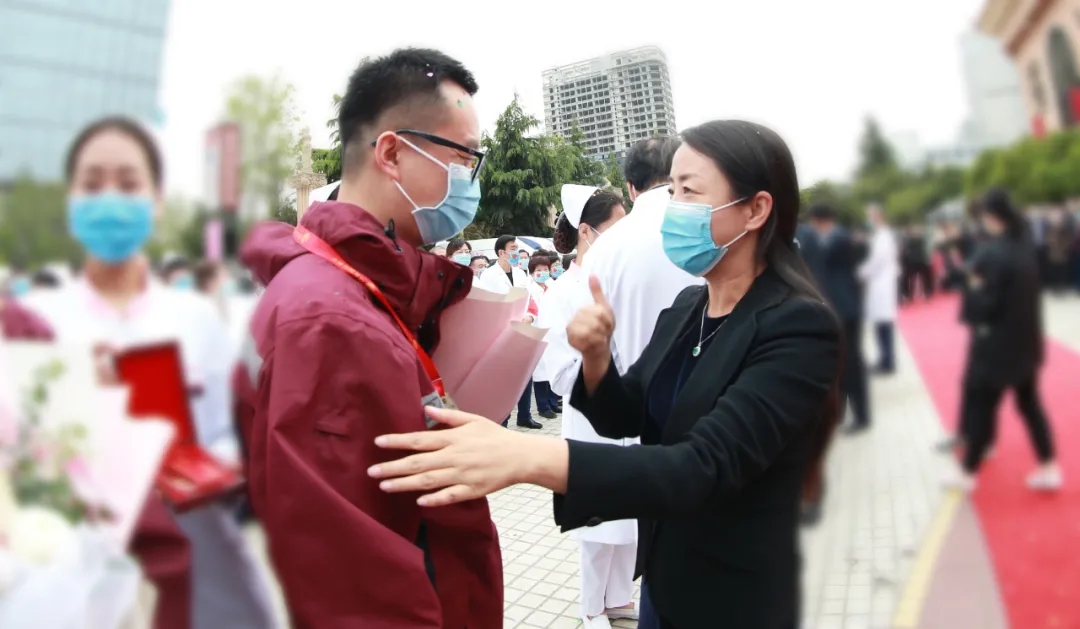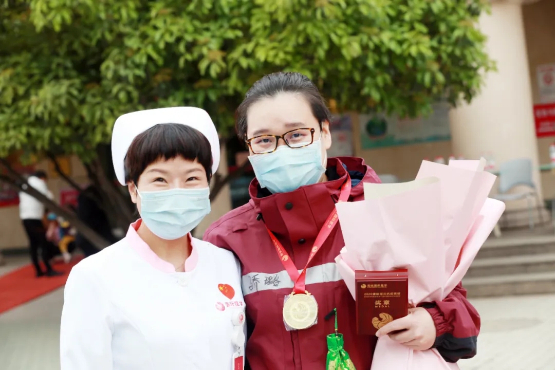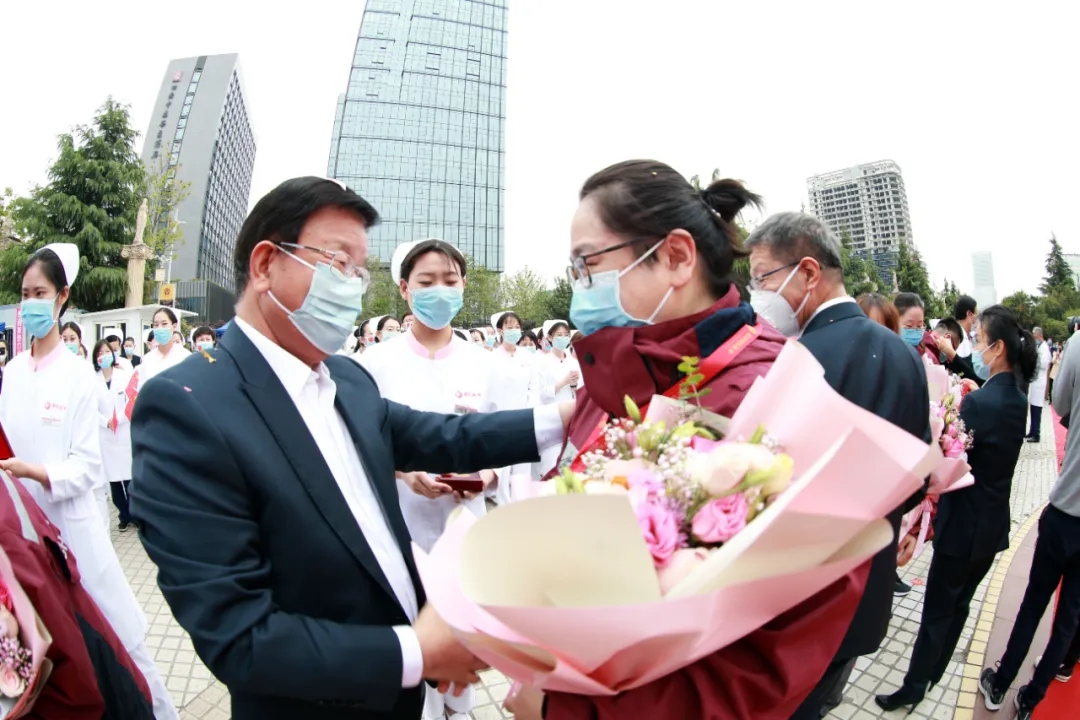 伴著悠揚(yáng)動(dòng)人的旋律,6名隊(duì)員手捧鮮花走過紅毯,步入歡迎儀式現(xiàn)場(chǎng)。集團(tuán)領(lǐng)導(dǎo)、醫(yī)院領(lǐng)導(dǎo)為隊(duì)員們授予“援助湖北抗疫英雄”稱號(hào)并頒發(fā)了英雄獎(jiǎng)?wù)隆?/span>