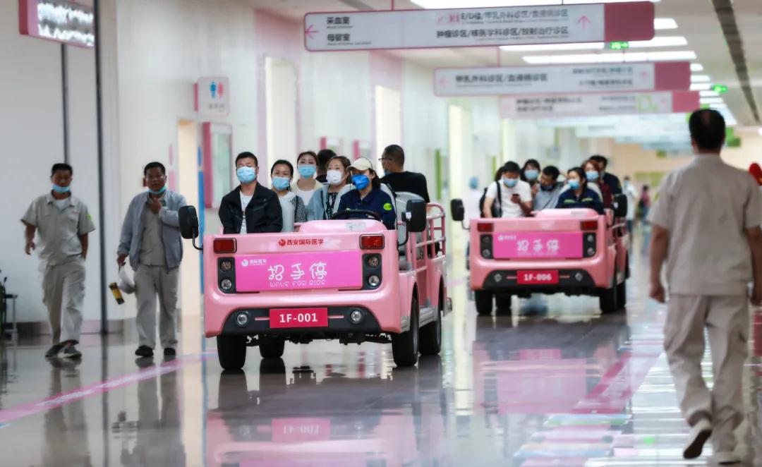 6月8日,在西安國際醫(yī)學中心醫(yī)院醫(yī)療大樓內(nèi),多輛“招手?!彪娖寇囌┧笤谧呃壤?,接送患者和醫(yī)護人員。