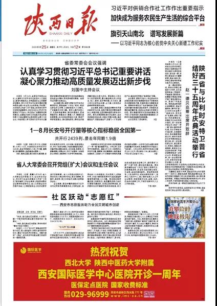 2020年9月25日,在西安國(guó)際醫(yī)學(xué)中心醫(yī)院一周歲生日之際,陜西日?qǐng)?bào)、西安晚報(bào)、華商報(bào)、三秦都市報(bào)、陽(yáng)光報(bào)分別刊文送上生日祝福。