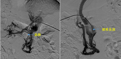 見此情形,韓國宏教授憑借豐富的臨床經(jīng)驗(yàn)很快調(diào)整了策略,在超聲診療中心的協(xié)助下進(jìn)行門靜脈右支穿刺,并進(jìn)行造影,看到目標(biāo)血管后,韓國宏教授用“明修棧道,暗渡陳倉”的方法,讓來自脾臟和胃腸的血流終于暢通的回流到了肝靜脈。通過血流的沖刷以及抗凝溶栓藥物的作用,幾日后復(fù)查造影發(fā)現(xiàn)門靜脈血栓已逐漸變小,不會(huì)對(duì)回流到肝臟的血流產(chǎn)生大的阻礙作用,門靜脈的壓力顯著減小,患者再次出血的幾率也隨之降低。幾經(jīng)周折,這顆“定時(shí)炸彈”終于被拆除,李女士和她的家人多年來心里的石頭也終于落地。