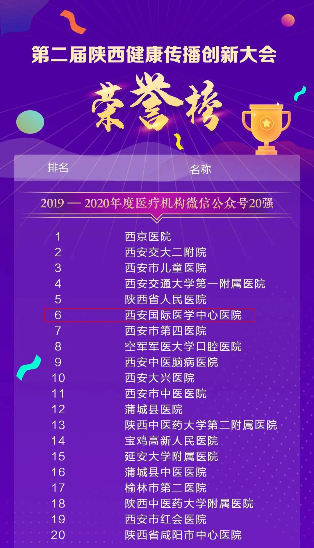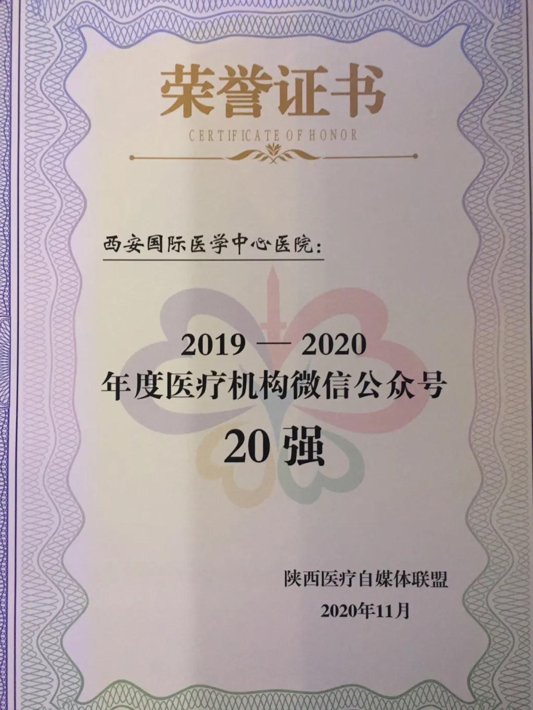 11月25日,由陜西省衛(wèi)生健康委員會(huì)、陜西省醫(yī)師協(xié)會(huì)指導(dǎo),陜西醫(yī)療自媒體聯(lián)盟、陜西省衛(wèi)生健康干部培訓(xùn)中心承辦的第二屆陜西健康傳播創(chuàng)新大會(huì)在西安召開。西安國際醫(yī)學(xué)中心醫(yī)院微信公眾號榮獲2020年陜盟醫(yī)療機(jī)構(gòu)微信公眾號第六名。