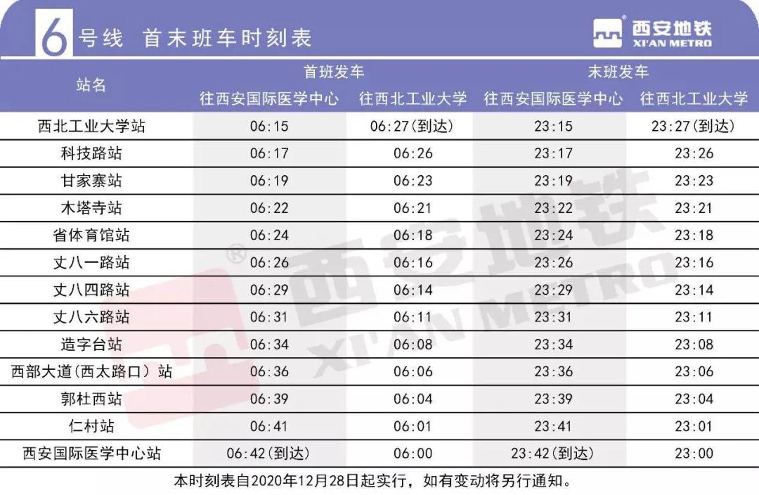 6號線一期開通初期全天開行單一交路,單程行駛時間為27分鐘。6號線一期西安國際醫(yī)學(xué)中心首末班車發(fā)車時間分別為6: 00、23: 00, 西北工業(yè)大學(xué)首末班車發(fā)車時間分別為6: 15、23: 15,全天運營服務(wù)時間17小時43分。線路總體分布情況如圖: