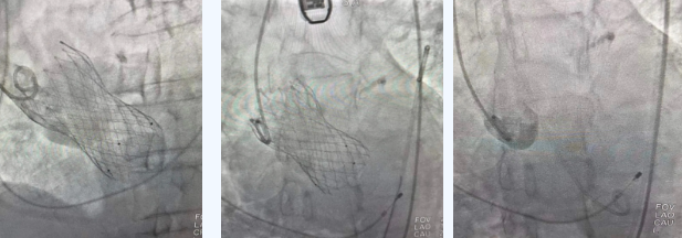 術(shù)中,曾廣偉主任團(tuán)隊(duì)高效配合,完成了特定時(shí)間點(diǎn)起搏心臟、臨時(shí)短時(shí)間關(guān)閉呼吸機(jī)、降低主動(dòng)脈瓣阻力、快速釋放瓣膜等一系列高難度操作,有效保證瓣膜精準(zhǔn)釋放。瓣膜釋放經(jīng)TEE確認(rèn),主動(dòng)脈瓣膜釋放位置佳,經(jīng)豬尾導(dǎo)管造影,主動(dòng)脈瓣返流即刻消失,且無(wú)瓣周瘺。