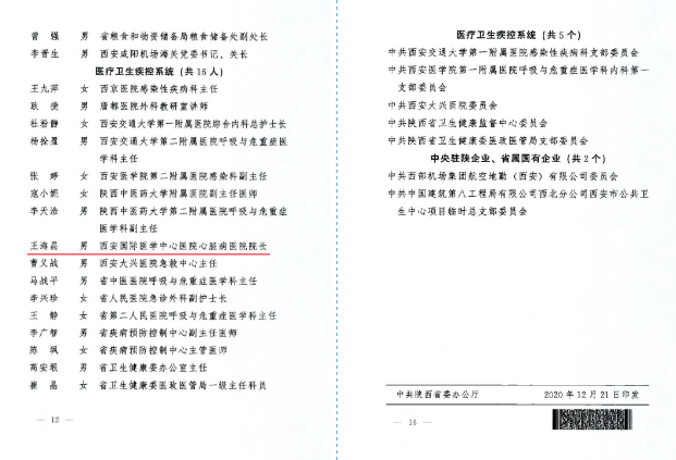 近期,中共陜西省委印發(fā)《關(guān)于表彰全省優(yōu)秀共產(chǎn)黨員和全省先進基層黨組織的決定》,對在抗擊新冠肺炎疫情中涌現(xiàn)出來的134名優(yōu)秀共產(chǎn)黨員和45個先進基層黨組織進行了表彰。西安國際醫(yī)學中心醫(yī)院心臟病醫(yī)院院長王海昌被評為“陜西省優(yōu)秀共產(chǎn)黨員”。