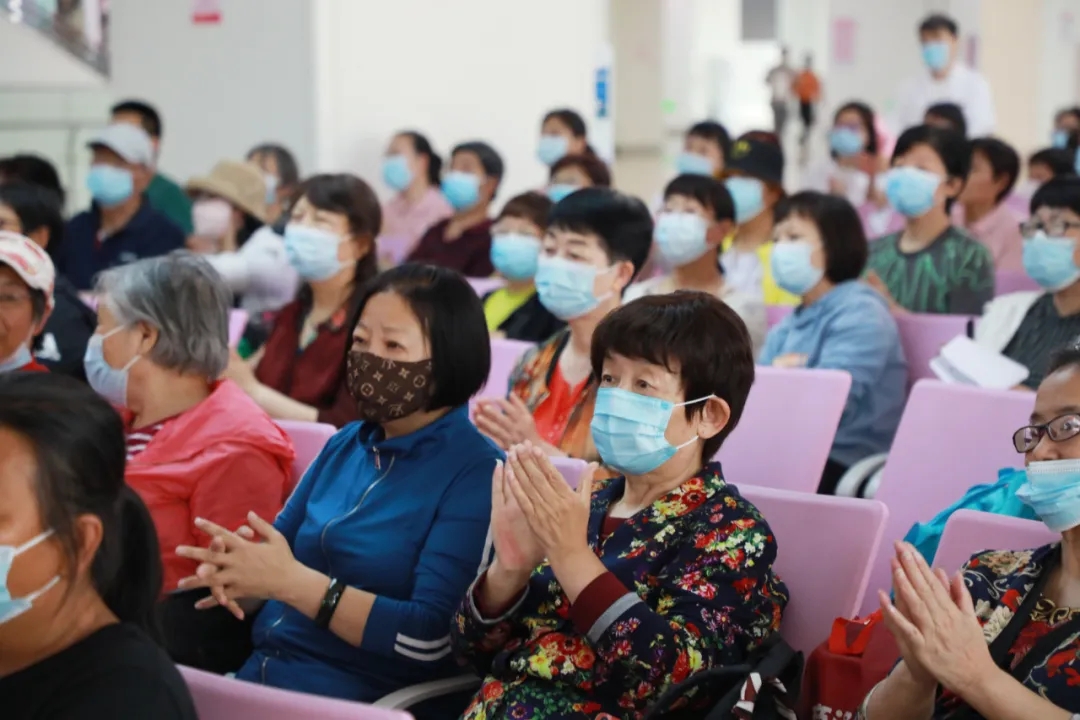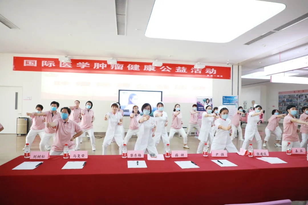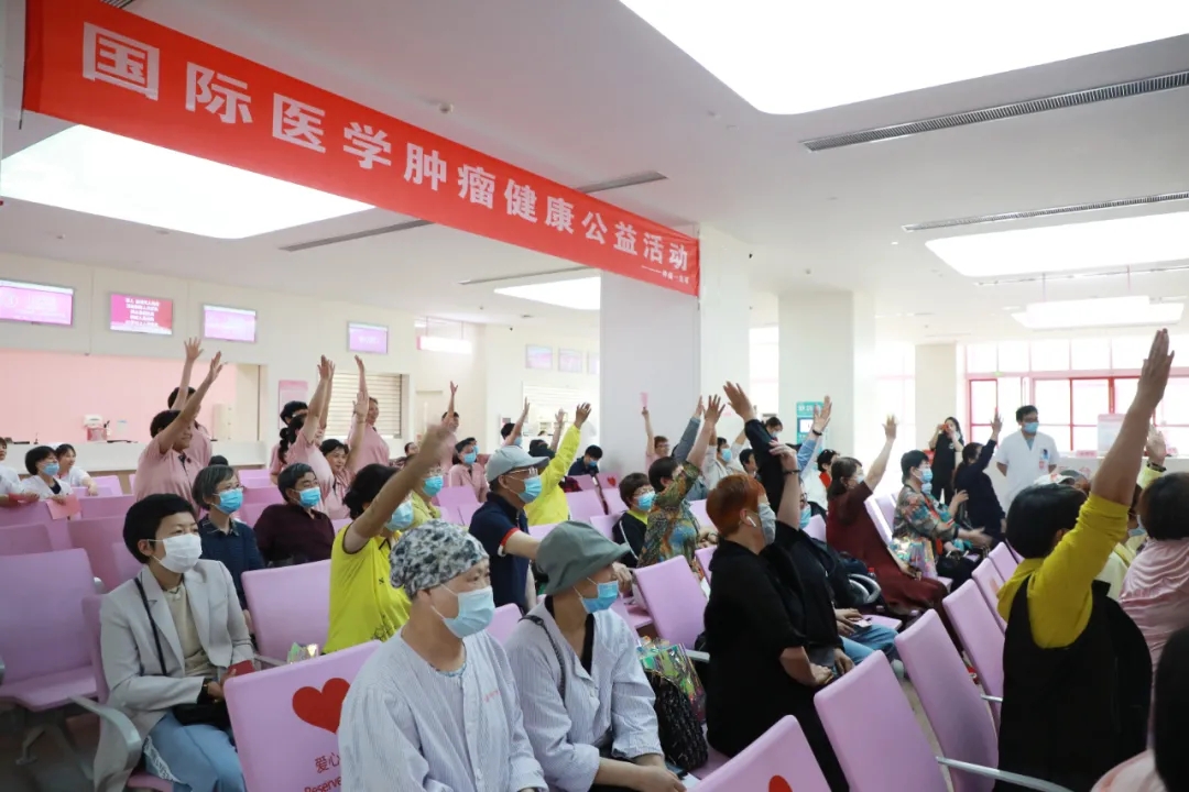 腫瘤一病區(qū)的醫(yī)護(hù)人員和志愿者們共同演練了一段八段錦,隨后的健康知識(shí)問(wèn)答和歌曲快閃環(huán)節(jié)將活動(dòng)氛圍推向高潮,大家爭(zhēng)先恐后地舉手搶答,現(xiàn)場(chǎng)問(wèn)答也促進(jìn)了對(duì)于腫瘤防治、康復(fù)知識(shí)的推廣。最后,大家合唱歌曲“相信我們會(huì)創(chuàng)造奇跡”,積極、歡樂(lè)的氛圍縈繞不息。活動(dòng)最后,薛妍副院長(zhǎng)、劉樹(shù)松教授和張俊美醫(yī)生對(duì)患者的提問(wèn)進(jìn)行了耐心、細(xì)致的解答。