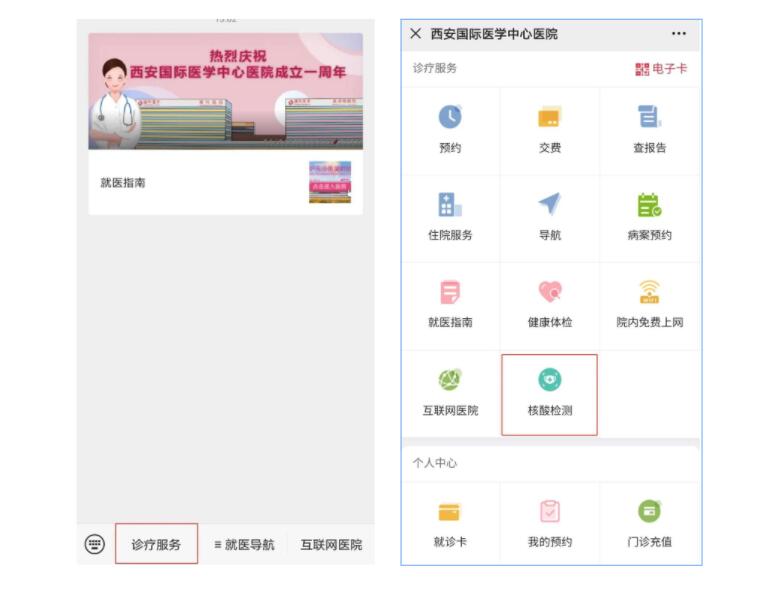 醫(yī)院核酸檢測已開通線上預(yù)約,大家可通過“西安國際醫(yī)學(xué)中心醫(yī)院服務(wù)號(hào)”微信公眾號(hào)進(jìn)行預(yù)約。