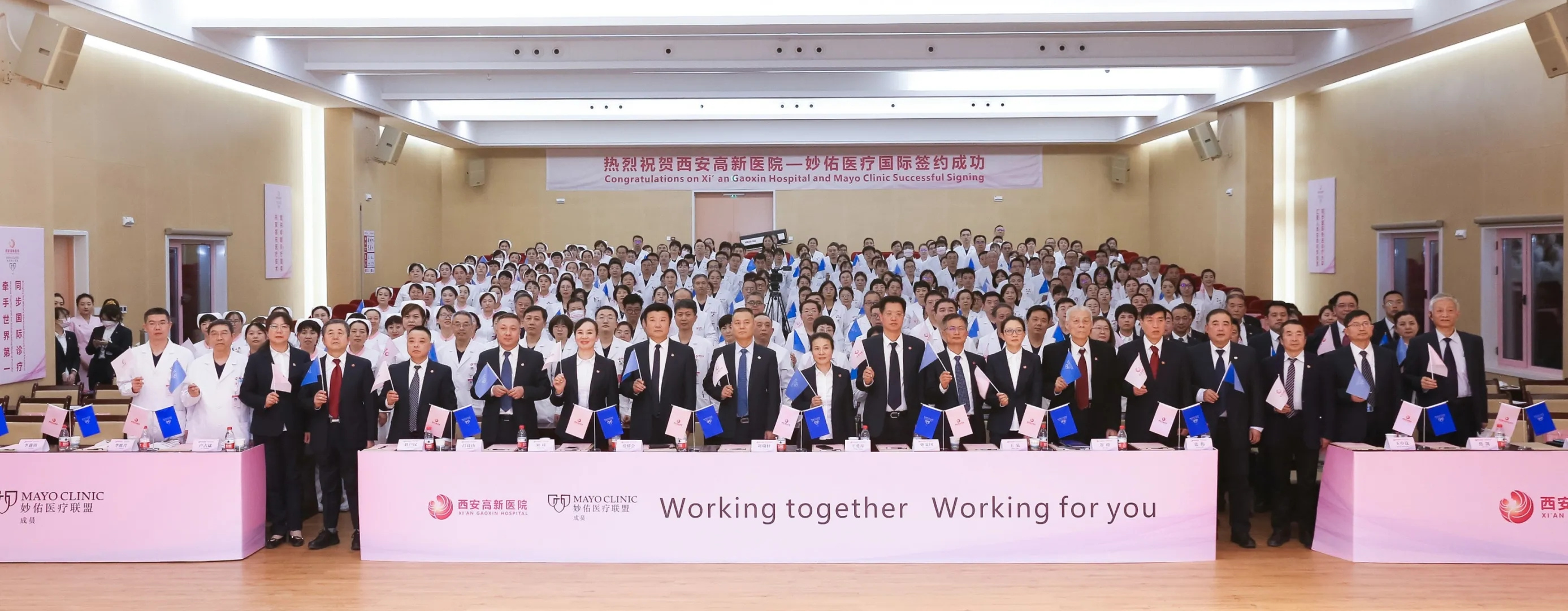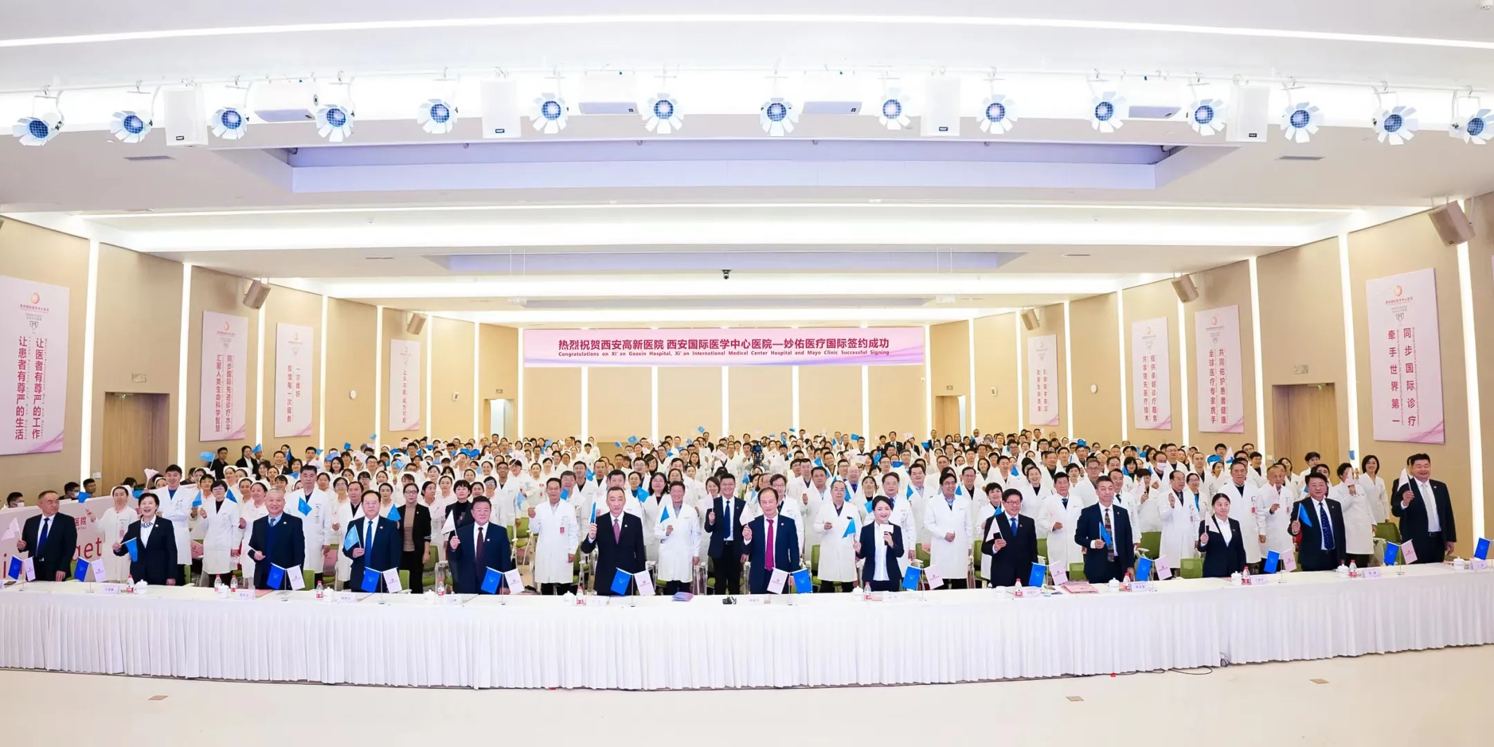 儀式上,妙佑醫(yī)療國(guó)際(Mayo Clinic)醫(yī)療執(zhí)行總監(jiān)思迪絲?瑞扎與西安國(guó)際醫(yī)學(xué)中心醫(yī)院院長(zhǎng)尹強(qiáng)、西安高新醫(yī)院院長(zhǎng)宋瑛共同簽署合作協(xié)議,并將聯(lián)盟醫(yī)院水晶杯授予兩家醫(yī)院。