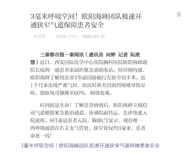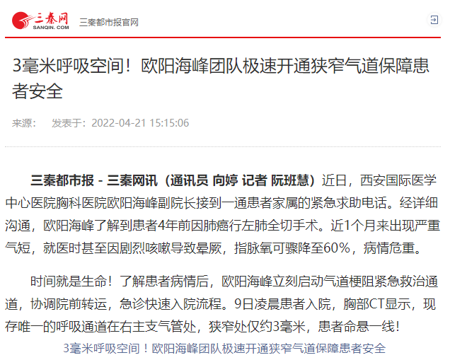 三秦都市報(bào):3毫米呼吸空間!歐陽海峰團(tuán)隊(duì)極速開通狹窄氣道保障患者安全