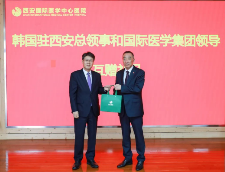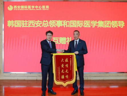 隨后,韓國駐西安總領(lǐng)事館向西安國際醫(yī)學(xué)中心醫(yī)院贈(zèng)送錦旗,雙方互贈(zèng)禮物并合影留念。