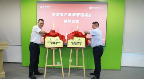 劉瑞軒總裁與王作全行長(zhǎng)共同為“長(zhǎng)安銀行財(cái)富客戶健康管理合作基地”“長(zhǎng)安銀行財(cái)富客戶健康管理VIP室”揭牌。