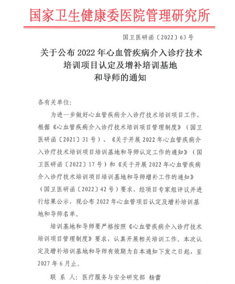 心血管疾病介入診療技術培訓項目認定及增補培訓基地和導師的評選由國家衛(wèi)生健康委醫(yī)院管理研究所主持,在全國范圍內遴選,經項目專家組評議并進行結果公示,最終確定。本次入選標志著西安國際醫(yī)學中心醫(yī)院心臟病醫(yī)院在心律失常和結構性心臟病介入診療水平、培訓實力等方面均獲得國家權威機構的認可。