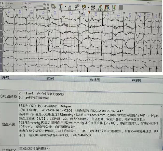檢查前,心電檢查中心醫(yī)生仔細(xì)詢問患者病史,并簽署知情同意書后,進行正式檢查。打開錄播系統(tǒng)及傾斜試驗系統(tǒng),心電檢查中心張錄興主任帶領(lǐng)兩位醫(yī)生進行看護,傾斜前及傾斜后密切觀察患者的心率、血壓和自身狀態(tài)。當(dāng)傾斜70?后4分鐘患者心率及血壓開始變化,自述頭暈想吐。即可恢復(fù)平臥位后測量血壓,患者出現(xiàn)體位變化后發(fā)生嘔吐,伴隨心率由快變慢,并出現(xiàn)明顯竇性心動過緩伴不齊,最慢可達46次/分,嘔吐過后心率逐漸上升90次/分,患者自述暈厥癥狀消失,血壓心率平穩(wěn)后,試驗結(jié)束,診斷暈厥試驗可疑陽性。