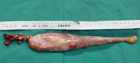 手術(shù)刀游走在人體血管的江河湖海,在完全游離肝臟顯露全段下腔靜脈后,依次有序阻閉“主干道”的血流供應(yīng),最后阻斷肝臟血供,于肝臟尾狀葉肝短靜脈下方切開下腔靜脈,借助經(jīng)食管超聲實時嚴(yán)密的監(jiān)控,經(jīng)下腔靜脈切口順利取出位于右心房、膈上下腔靜脈、肝后下腔靜脈內(nèi)的瘤栓,隨即阻閉膈下腔靜脈,同時恢復(fù)肝臟血流“通航”。手術(shù)刀繼續(xù)向下行進(jìn),一點一點地剝離下腔靜脈遠(yuǎn)心段直至右側(cè)髂總靜脈、右側(cè)髂內(nèi)靜脈內(nèi)的瘤栓,最終,一根長達(dá)35cm、最寬直徑5cm的腔靜脈瘤栓被完整取出!