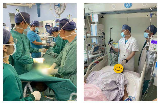 當(dāng)晚11:50分,胸腔外科、呼吸與危急重癥醫(yī)學(xué)科、麻醉手術(shù)中心以及心臟外科共同為患者實(shí)施手術(shù)。在麻醉手術(shù)中心的配合下,先由歐陽海峰副院長采用支氣管鏡技術(shù)進(jìn)行金屬覆膜支架置入術(shù),但由于腫物封堵約95%的氣道區(qū)域,支氣管鏡下無法將腫物切除。李文海副院長隨即實(shí)施右全肺切除術(shù)。術(shù)中,心臟外科二病區(qū)程亮主任采用體外膜肺氧合(ECMO)為患者維持氧飽和度及肺部血供。歷經(jīng)10小時(shí),手術(shù)順利完成。
