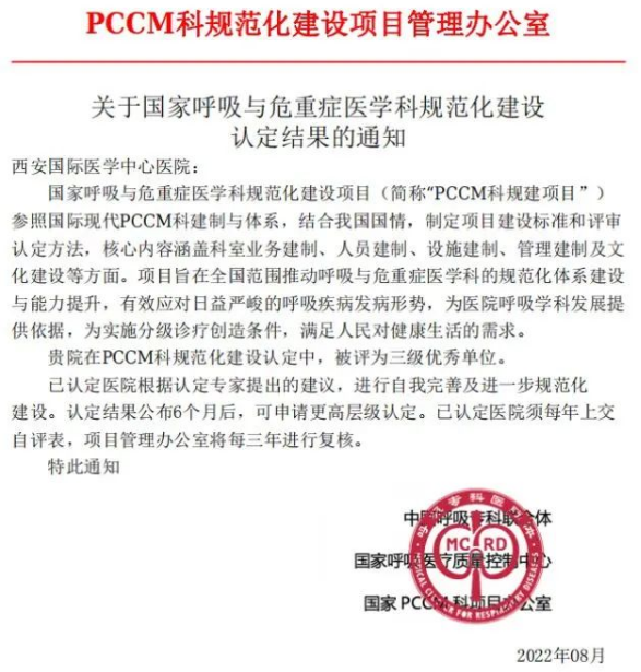 近日,國家呼吸與危重癥醫(yī)學(xué)科規(guī)范化建設(shè)項(xiàng)目管理辦公室發(fā)布新聞,西安國際醫(yī)學(xué)中心醫(yī)院獲國家呼吸與危重癥醫(yī)學(xué)科規(guī)范化建設(shè)三級(jí)醫(yī)院優(yōu)秀單位。據(jù)悉,這是省內(nèi)繼西京醫(yī)院、唐都醫(yī)院、交大一附院、交大二附院后,第五家獲此殊榮的單位,標(biāo)志著該院呼吸與危重癥醫(yī)學(xué)科綜合實(shí)力躋身國家優(yōu)秀行列。