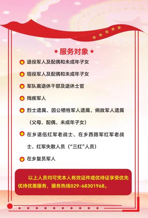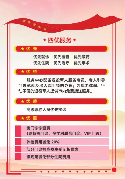 長(zhǎng)期以來(lái),醫(yī)院把“尊崇軍人,致敬軍屬”落到實(shí)處。一是對(duì)退役軍人實(shí)行優(yōu)撫。對(duì)退、現(xiàn)役軍人及其配偶和未成年子女;因公犧牲軍人直系親屬;軍隊(duì)離退休干部及退休士官;在鄉(xiāng)退伍紅軍老戰(zhàn)士、在鄉(xiāng)西路軍紅軍老戰(zhàn)士、“三紅”人員;殘疾軍人;在鄉(xiāng)復(fù)員軍人等優(yōu)撫對(duì)象來(lái)院享受門(mén)診就診優(yōu)先;住院優(yōu)先;窗口手續(xù)辦理優(yōu)先;檢驗(yàn)檢查優(yōu)先;城區(qū)范圍內(nèi)救護(hù)車免費(fèi)接送(預(yù)約電話:029—966120);特殊人員一對(duì)一陪診。二是優(yōu)撫對(duì)象就診時(shí)享受免門(mén)診診查費(fèi);部分門(mén)診檢查費(fèi)享受8折優(yōu)惠;體檢費(fèi)用減免20%;按規(guī)定減免部分住院費(fèi)用。